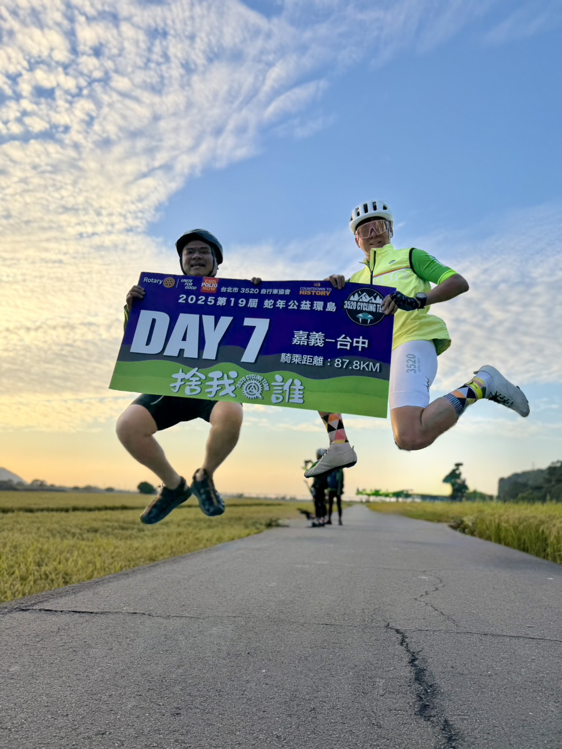 國際扶輪3521地區於 11月15日至11月23日 展開自行車「2025蛇年公益環島」活動,隊伍自 大佳河濱公園8號水門 正式出發。首日天氣晴朗,參與騎士們精神飽滿,在歡笑、汗水與彼此的鼓勵中,為公益踏出堅定的第一步。沿途騎行、補給、再出發,每一段路都承載著團結與善意。我們秉持「一起出發、一起到達」的精神,讓愛與公益的力量在環島的九天旅程中持續延伸。
